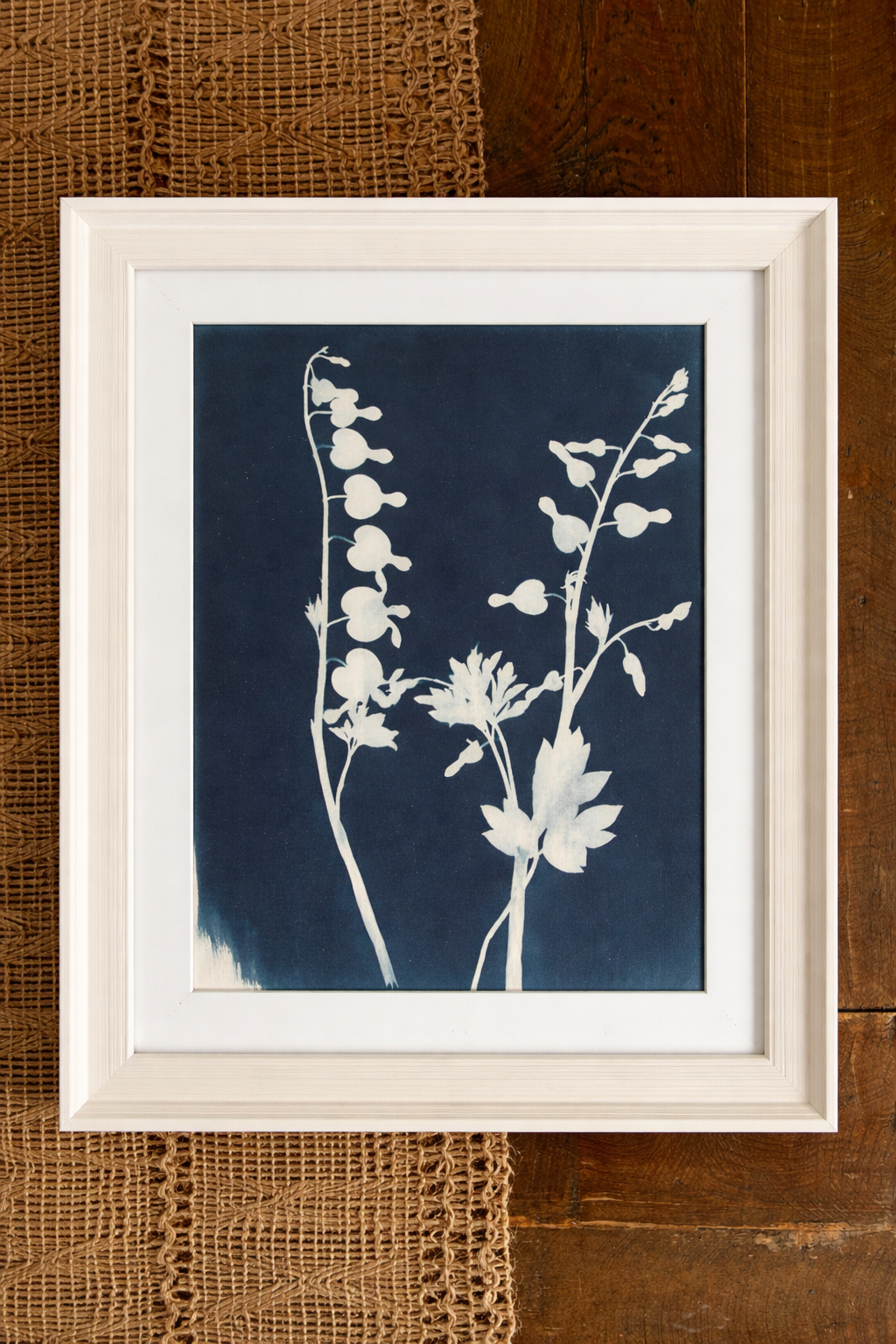 This Bleeding Heart cyanotype print captures the natural elegance of these iconic blooms in rich, inky blues. Each petal and stem is beautifully preserved through the sun-printing process, creating a soft, almost ethereal silhouette.